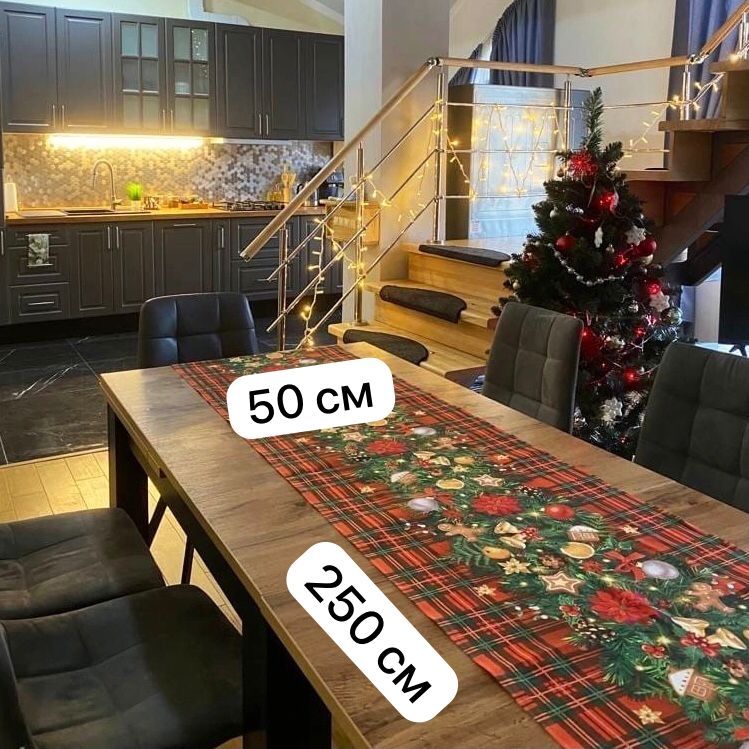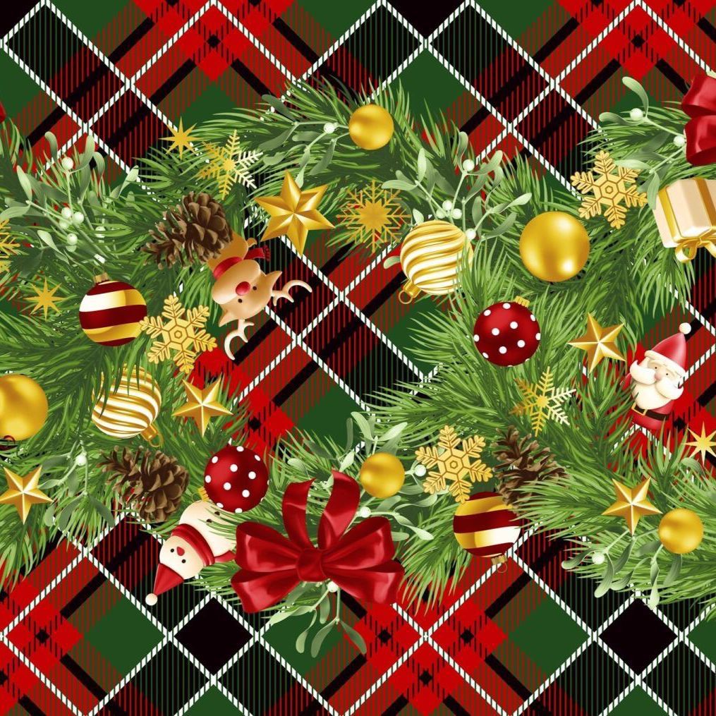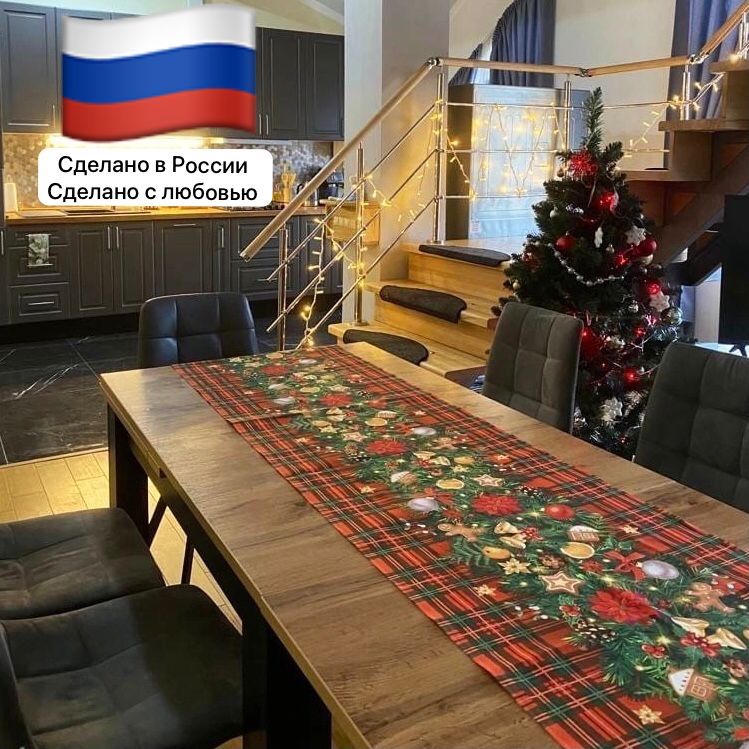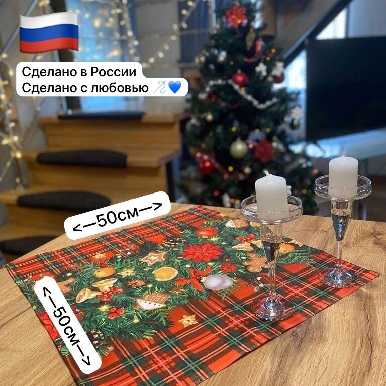 Праздничная тематическая салфетка "Еловая гирлянда" (50*50 +-2 см) для оформления новогоднего и рождественского стола, как самостоятельно, так и поверх однотонной белой или иного цвета скатерти.